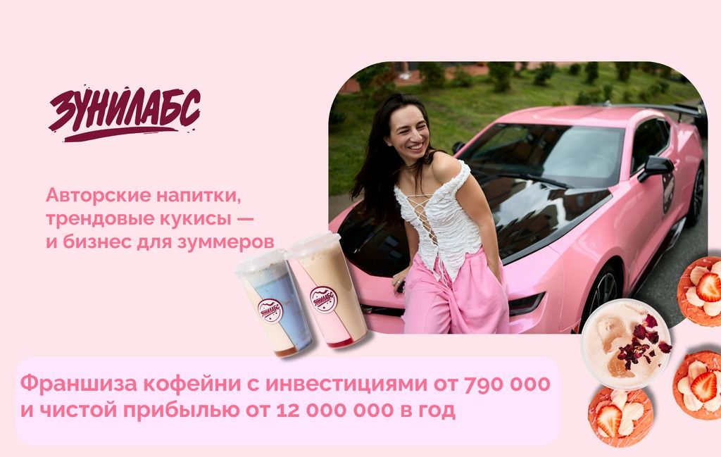 Рекомендуем обратиться к компании «Зунилабс». Это сеть ярких кофеен с трендовым и авторским меню для зумеров и других поколений: эксклюзивные напитки в двойных стаканах, кукисы, дабблы. Вложения в открытие кофейни – от 790 000 рублей в зависимости от формата. Партнёрам фирма помогает комплексно от готового меню и обучения бариста до стратегии привлечения большого потока людей, грамотного маркетинга и it-составляющей.