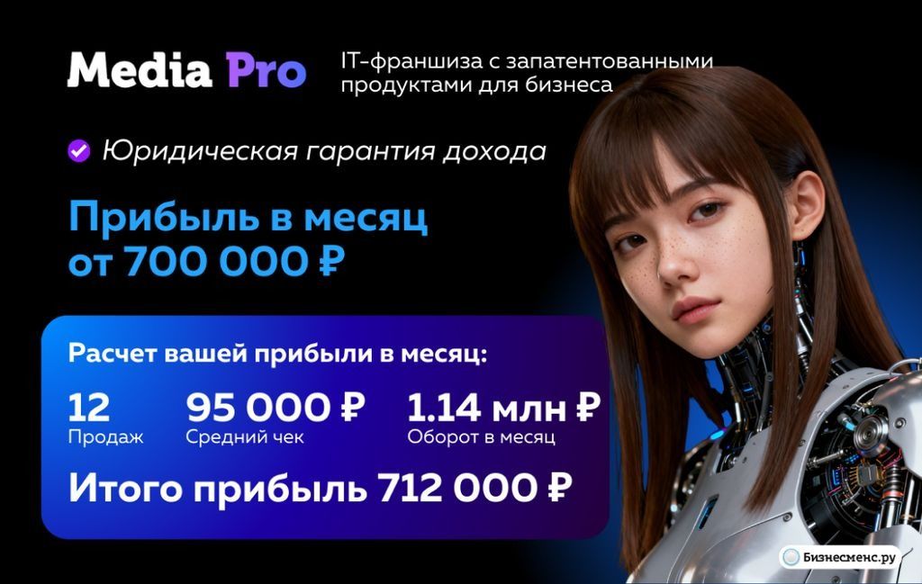 Рекомендуем обратиться к компании Media Pro. Это разработчик готовых рекламных решений для любого бизнеса на основе нейросетей. Фирма создаёт голосовых роботов, системы автопостинга контента, умные колл-центры. Клиенты - все: стоматологии, бары, кафе, парикмахерские, банки, нефтяные компании - абсолютно любой бизнес. А ещё у них можно купить франшизу и продавать готовые нейросети компаниям в своём городе. Опыт не нужен, вас научат всему, а всю техническую часть оставят на себе. Зарабатывать можно от 712 000 рублей в месяц чистыми. Это статистика по сети.