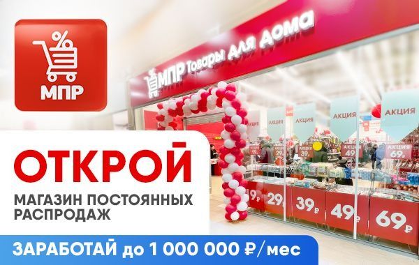 15. Магазин Постоянных Распродаж (МПР) — франшиза магазинов недорогих товаров для дома. Проект на рынке более 30 лет. Управляющая компания контролирует спрос во всех точках сети и централизованно формирует индивидуальный ассортимент для каждого региона. По РФ уже работает более 500 магазинов. Средняя ежемесячная прибыль по сети МПР — 500 тыс. рублей. Вложения в открытие магазина 100-300 кв. м. — от 4,7 млн рублей.