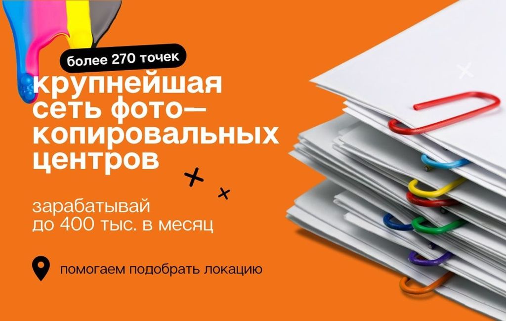 16. Копирка — это франшиза копировального центра с большим количеством услуг, их более 300. В каталоге: копирование, ламинирование, сканирование, изготовления визиток, изготовление печатей, факсимиле и др. У компании 2 собственных производства, которые могут выполнять заказы любой сложности. У компании 400 тыс. постоянных клиентов, каждый месяц выполняют более 2,5 млн заказов. По франшизе каждый партнёр получает помощь в закупке оборудования, обучение, единый колл-центр. Вложения — от 1,3 млн рублей.