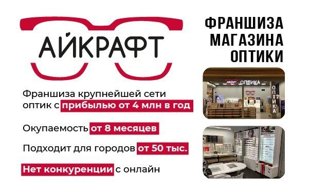 7. Айкрафт — франшиза оптики «у дома». Один из крупнейших брендов на своём рынке, в России работают уже более 500 точек. По статистике, каждые 6-е очки в стране покупаются в «Айкрафт». Средняя чистая прибыль одной оптики 30-50 кв. м. — 320 тыс. рублей. Каждый франчайзи получает выбор локации и подбор сотрудников «под ключ», куратора от Управляющей Компании на весь этап открытия. Стартовые инвестиции в организацию такого бизнеса начинаются с 2,5 млн рублей.