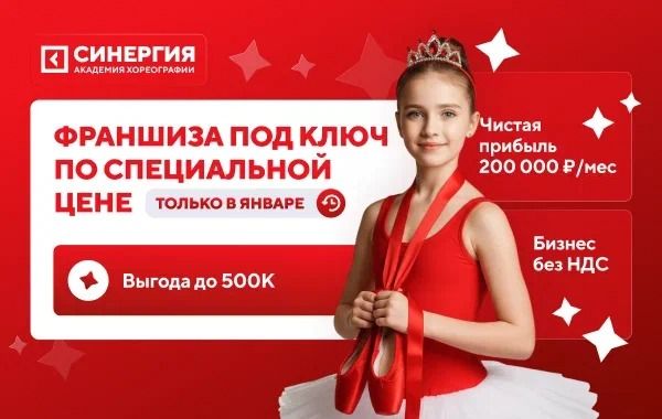 25. Франшиза танцевальных школ «Синергия», с которой вы сможете зарабатывать до 420 тыс. чистыми каждый месяц. От франчайзи Управляющая компания не требует хореографического опыта. Поддержка полная по всем направлениям. «Синергия» — компания с более, чем 30-летним опытом на рынке дополнительного образования. У команды есть успешные проект в самых разных нишах, от спортивных секций до школ программирования. Общий годовой оборот холдинга — более 15 млрд рублей. По договору франшизу уже открыто более 10 студий балета, вложения в открытие одной — от 426 тыс. рублей.