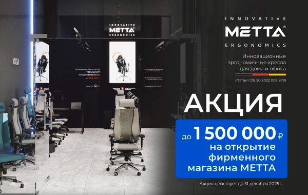 43. МЕТТА — франшиза магазина технологичных кресел напрямую от производителя. В каталоге более 10 млн конфигураций мебели. Магазины МЕТТА открыты в 120 городах. Ежемесячно все магазины продают более 50 тыс. кресел. Каждый партнёр франшизы получает прямые поставки всего ассортимента, гарантировано с 0% брака. Нет роялти. Вложения в открытие одного магазина — от 1,6 млн рублей. Чистая прибыль — от 250 тыс. рублей в месяц.