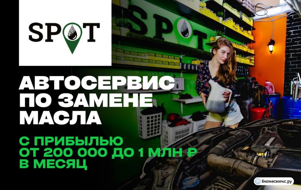 47. SPOT — франшиза автосервисов по замене масла от лидеров на рынке Санкт-Петербурга. Открыли более 70 точек. Каждая станция приносит владельцу до 1 млн рублей чистыми. Партнёр франшизы получает схемы, спецификацию оборудования и стандарты оформления точки. Персонал всей сети проходит стажировку в главном сервисе в Санкт-Петербурге. Вложения в открытие — от 4,4 млн рублей.