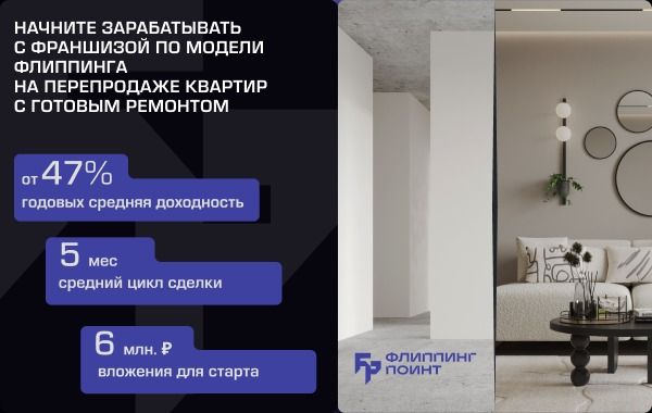 23. Флиппинг Поинт — франшиза на рынке недвижимости. Бизнес-модель построена на перепродаже квартир, загородных домов и коммерческих площадей. Берут в оборот не только готовые новостройки, но и вторичное жильё. Доходность инвестиций держат на уровне от 40%, франчайзинговые филиалы тоже. Для франчайзи помогают привлечь инвестиции, выбрать объекты, решить все юр. вопросы,. Вложения в открытие филиала «Флиппинг Поинт» по франшизе, в зависимости от города, формата сотрудничества и объёма недвижимости на старте — от 7 млн рублей.