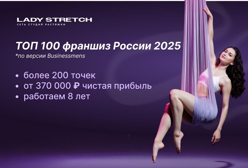 21. Lady Stretch — франшиза студии растяжки с чистой прибылью от 300 тыс. рублей в месяц и гарантированной окупаемостью. 9 из 10 франчайзи выходят на «план» по ключевым показателям в первые полгода. При этом, большинство партнёров франшизы открывает с Lady Stretch свой первый бизнес. Сильной стороной франшизы является старт за срок от 3 недель. Стартовые вложения — от 2,1 млн рублей.