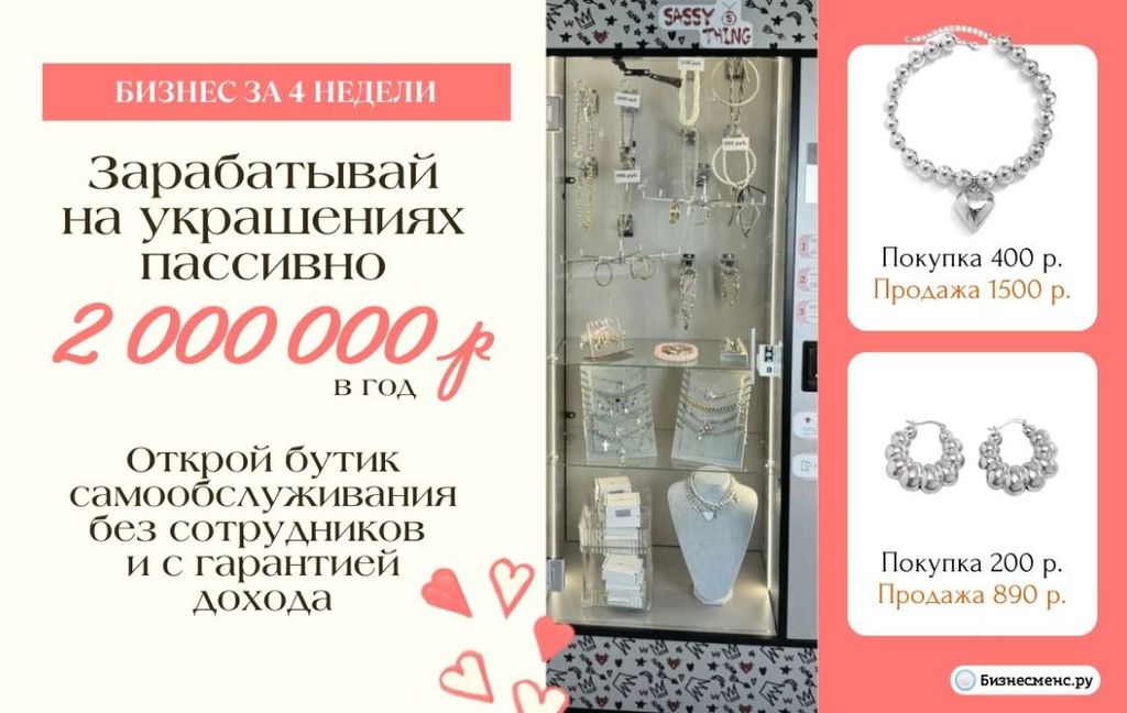 24. С Sassy Thing вы сможете начать бизнес на вендинговых аппаратах с украшениями. Здесь украшения часто с эксклюзивным дизайном и всегда ручной работы. Наценка на такую продукцию — 300-500%. Маркетинг настраивают так, что в среднем каждый вендинг делает по 3 продажи в день. Это при том, что точка безубыточности — между 1 и 2 продажами. Доход для франчайзи Sassy Thing можно считать пассивным, потому что на обслуживание уходит до 2 часов в неделю. Чистая прибыль одной точки — 150 тыс. рублей в месяц. По договору гарантируется возврат вложений, размер которых — от 359 тыс. рублей.
