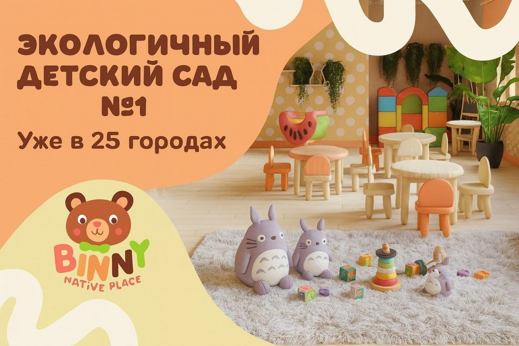 14. Binny Native Place — франшиза экологичных детских садов. Компания-лидер, входят в топ-3 по всем ключевым запросам в своей нише в поисковиках. Уже открыли 30+ детских садов по России, чистая прибыль каждого — от 300 тыс. рублей. Для партнёра франшиза Binny Native Place — это бизнес «под ключ», сопровождает от поиска и ремонта помещения до маркетинга, рекламы и торжественного открытия. Стартовые инвестиции — от 3,7 млн рублей.
