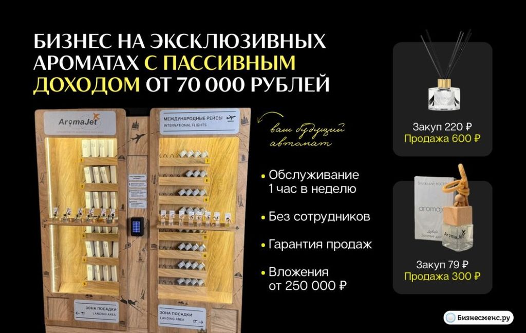 28. AromaJet — франшиза магазинов самообслуживания автопарфюма и диффузоров. Более 100 ароматов в ассортименте. Уже открыто 70 магазинов, 60 — франчайзинговые. Бизнес управляется через мобильное приложение, по времени уходит меньше часа в неделю. Доход каждой станции — от 80 тыс. рублей. Сотрудников нет, аренда минимальная. Точка безубыточности – 1 продажа в день, среднее количество продаж — 3, для одного вендинга. Вложения — от 379 тыс. рублей.