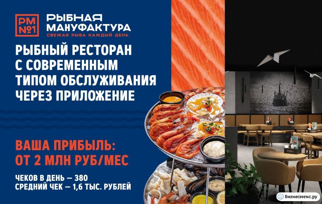 3. Рыбная мануфактура — франшиза рыбного ресторана с доступными ценами. На рынке с 2012 года. Акцент в работе делается на доставку и самовывоз, а обслуживание в зале происходит через интерактивные панели. В зале почти нет официантов. Такой подход позволяет ускорить обслуживание, каждый ресторан делает по 350-400 чеков в день, более 20 млн выручки в месяц с рентабельностью 12%. Вложение в открытие от 47 млн рублей.