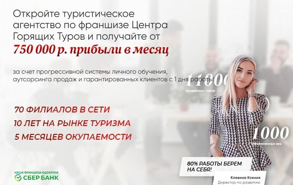 50. Центр горящих туров — франшиза туристического и визового агентства. Продают билеты, туры, оформляют визы и ВНЖ. У франшизы 2 формата: с офисом и сотрудниками и полностью онлайн. В онлайн-формате можно совмещать с основной работой. Работа отнимает несколько часов в неделю. Средняя прибыль одного агентства 400 тыс. чистыми. Старт «под ключ», обучают менеджеров, подключают колл-центр. Вложения — от 320 тыс. рублей.