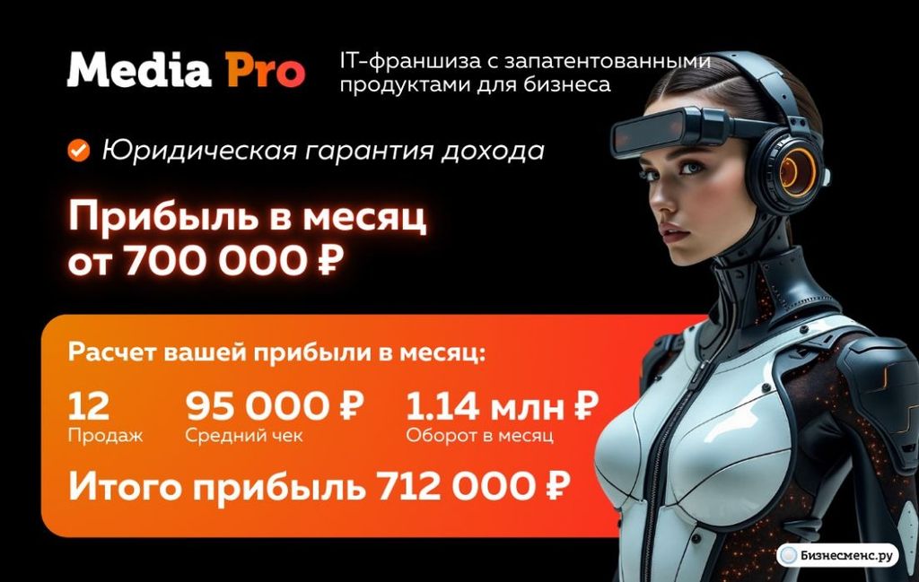 1. MediaPro — франшиза маркетингового агентства с запатентованными IT-продуктами. MediaPro свой маркетинг официально доверяют МТС Банк, BMW, Мегафон, ВТБ и др. Средний чек на услуги продвижения — 95 тыс. рублей. Маржинальность — от 80%. Бизнес-модель сочетает разовые проекты и регулярные платежи за ведение, что повышает LTV клиентов и сглаживает сезонность спроса. Средняя чистая прибыль со всех направлений для одного филиала — 712 тыс. рублей в месяц. Вложения в открытие по франшизе — от 630 тыс. рублей (паушальный 600 тыс. рублей, роялти — до 20%).