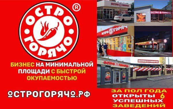 13. ОстроГорячо — франшиза кафе быстрого питания. Фирменное блюдо — жареная курица в панировке. Бренд на рынке с 1997 года, готовят более 300 блюд. Всё меню готовится на минимальном количестве оборудования, кафе открываются даже на площади от 15 кв. м. Предоставляют «эксклюзив» на регион и очное обучение на базе действующего заведения. Вложения в открытие одного кафе «ОстроГорячо» — от 1,5 млн рублей.