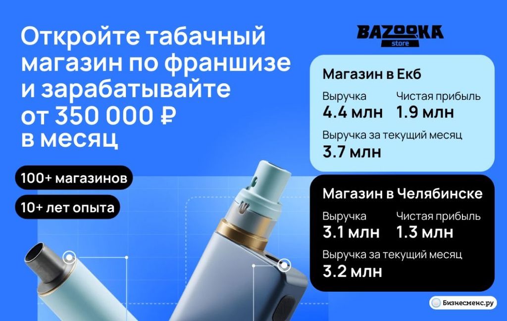 42. Bazooka Store — это франшиза магазина табачной продукции. Компания на российском рынке с 2012 года, франшиза работает с 2019. За это время открыли более 150 точек, более 90% — по франшизе. Для партнеров обеспечивают запуск «под ключ», всего за 30 дней. В среднем, точка безубыточности — 3 месяца. К этому моменту доходы проекта полностью покрывают все расходы. Далее, средняя прибыль по году — 350 тыс. рублей. Вложения в открытие — от 1,5 млн рублей.
