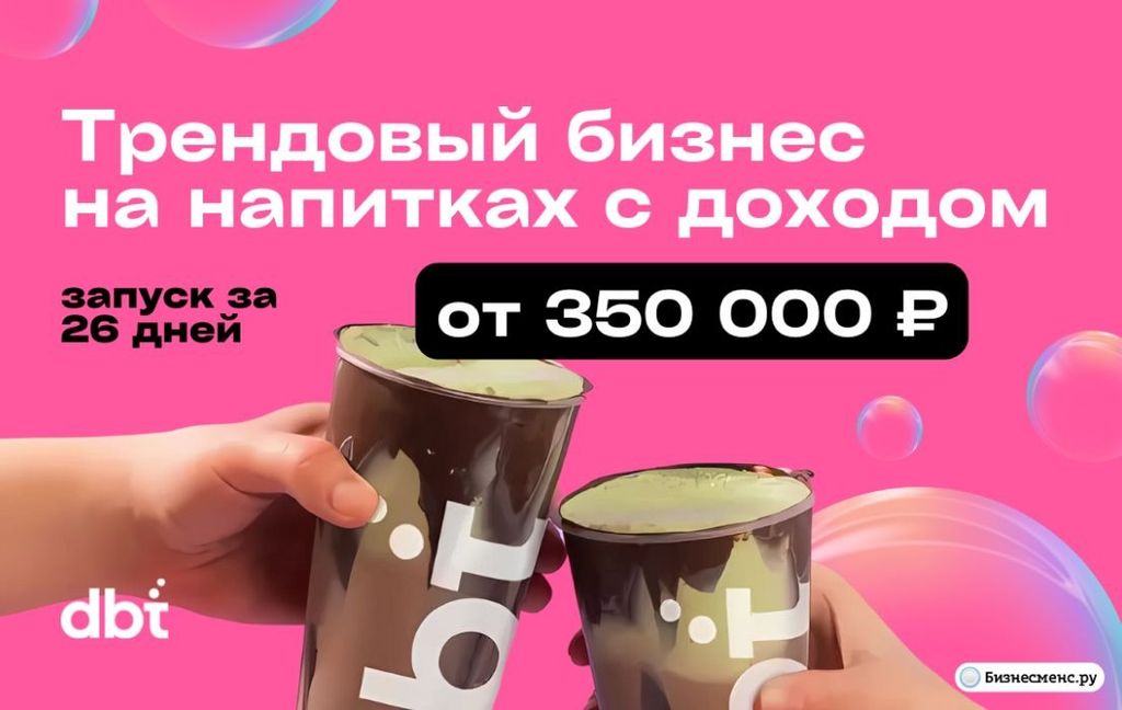 46. Double Bubble Tea — франшиза заведения чайных и кофейных напитков. Под брендом уже работает более 50 точек по РФ. Средняя чистая прибыль — от 350 тыс. рублей чистыми ежемесячно. На плановую прибыль Double Bubble Tea выходят за 1 месяц. Можно открыть точки в одном из трёх форматов: корнер, остров и кафе. Сырьё закупается в Китае и напрямую распределяется по заведениям сети. Средний объём стартовых вложений — от 3,9 млн рублей.