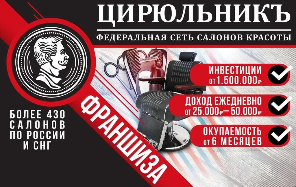 29. Цирюльникъ — франшиза салонов красоты эконом-класса. Цены на услуги от 149 рублей. В каталоге услуг: мужские и женские стрижки, маникюр и педикюр, массаж и косметология, СПА-процедуры и др. В среднем один салон обслуживает по 150 клиентов в день, флагман — 600+ в день. Вложения в открытие одного салона «Цирюльникъ» — от 1,5 млн рублей, средний срок окупаемости — до 5 месяцев.