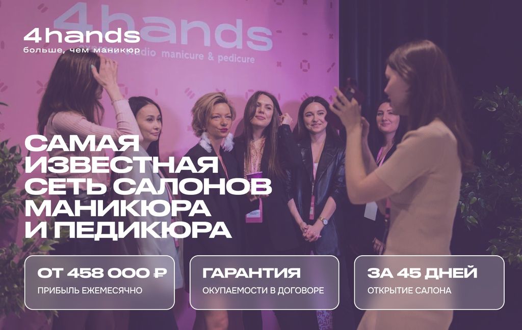 38. 4hands — франшиза салона маникюра и педикюра от компании, которая первой внедрила на рынке услугу «в 4 руки». С 2008 года бренд регулярно признавался лучшим в нише. Сегодня по франшизе открыты более 200 салонов по всему миру. 4hands представлен в США, Канаде, ОАЭ и других странах. 4hands выпускает линейки собственной косметики и уходовых средств, а бизнес-модель устроена так, что каждый партнёр получает на продаже этой продукции от 20% выручки ежемесячно. Средняя прибыль по сети — 458 тыс. рублей в месяц, вложения в открытие одного салона — от 3,1 млн рублей.