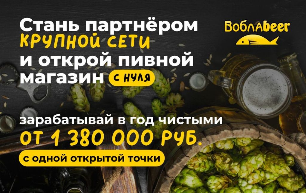 34. Воблаbeer — франшиза от татарстанской сети пивных магазинов. Уже открыли более 100 точек по России, 70 — франчайзинговые. Каждый партнёр получает помощь в поиске, аренде и ремонте торговой точки, подбор персонала «под ключ», список торгового оборудования с рекомендацией поставщиков в регионе. Чистая прибыль одного пивного магазина — от 150 тыс. рублей, вложения в открытие — от 1 млн рублей.