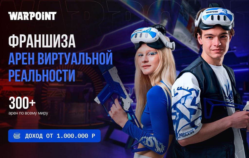 2. WARPOINT. По франшизе можно открыть арену виртуальной реальности. Точки работают уже в 17 странах, от Кипра до Тайланда. По всему миру работают более 300 точек. Бизнес-модель охватывает все сценарии игры: командные сражения, игры в одиночку, виртуальные аттракционы и гоночные симуляторы. Франчайзи получает весь каталог игр, тех. поддержку, ПО и обновления для игр. Вложения в открытие одной арены WARPOINT от 4 млн рублей.