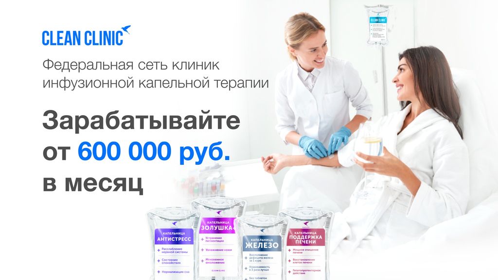 40. Clean Clinic — франшиза на рынке медицинских услуг. Специализируются на инфузорной терапии и оздоровительных процедурах. Ниша «молодая», конкуренция в вашем городе будет минимальная. Клиенты становятся постоянными сразу после первого визита. Вложения — от 1,4 млн рублей, включая паушальный 600 тыс. рублей. Роялти с 3-го месяца — 4%. Средняя чистая прибыль на одну клинику — от 600 тыс. рублей в месяц.