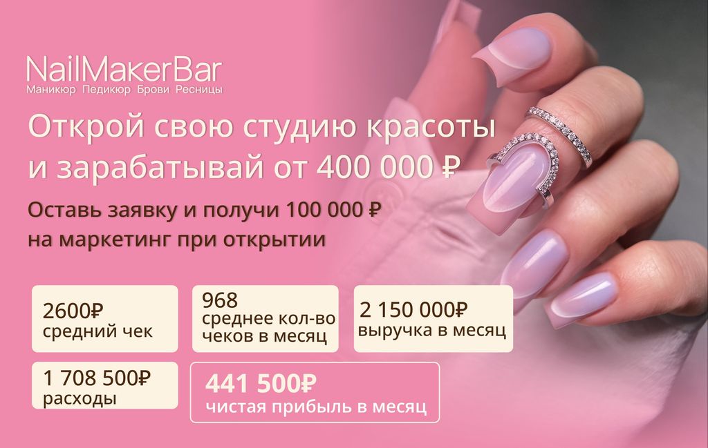 20. NailMaker Bar — франшиза студии маникюра, педикюра и бровей. Лидеры рынка Москвы и Московской области, компания открыла в столице 30+ салонов. На сегодня общая клиентская база — более 180 тыс. человек и каждый месяц привлекают более 2 тыс. новых клиентов. На сеть работает своя база поставщиков, единые колл-центр и маркетинговый отдел. Средняя чистая прибыль по сети для одного салона — от 400 тыс. рублей в месяц. Вложения в открытие одного салона — от 4,1 млн рублей.