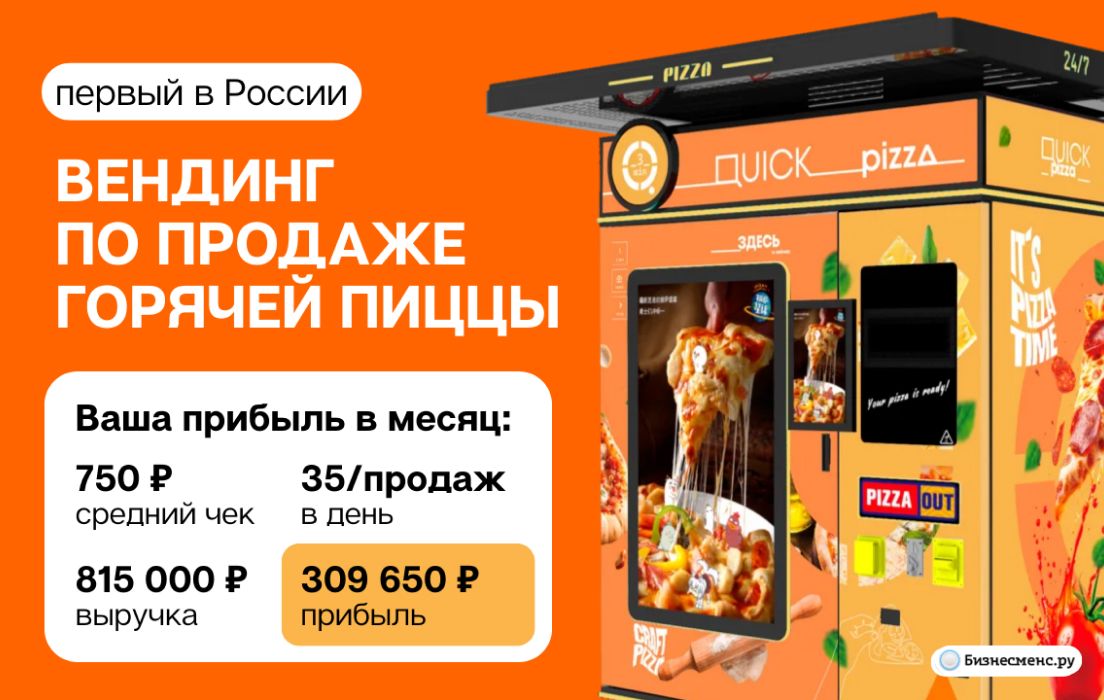 Рекомендуем обратиться к компании Quick Pizza. Фирма первой запустила в России сеть пиццаматов и сейчас активно набирает партнёров для размещения фирменных автоматов в разных городах. Помимо собственно готового оборудования, компания также поставляет партнёрам саму пиццу по спецрецептам, проводит аналитику по местам, где можно такие автоматы разместить, даёт софт для дистанционного управления и обучает работать с вендингом.