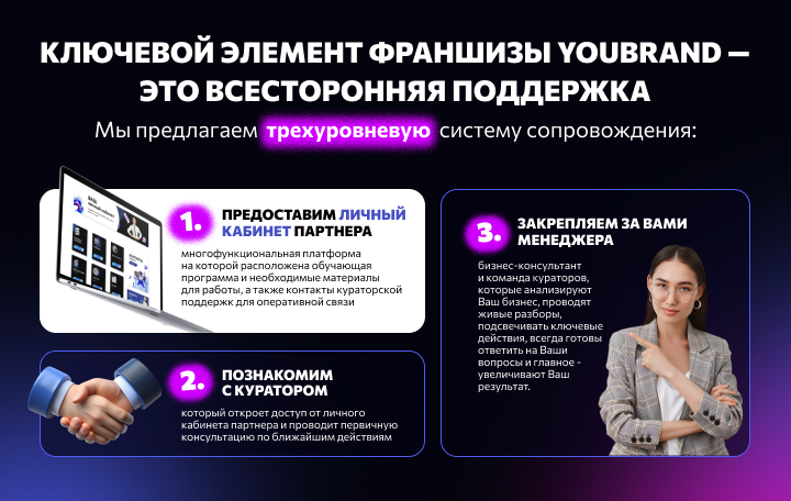 YouBrand - это не просто франшиза, а системный бизнес, где мы берем на себя рутину, а партнер фокусируется на развитии.