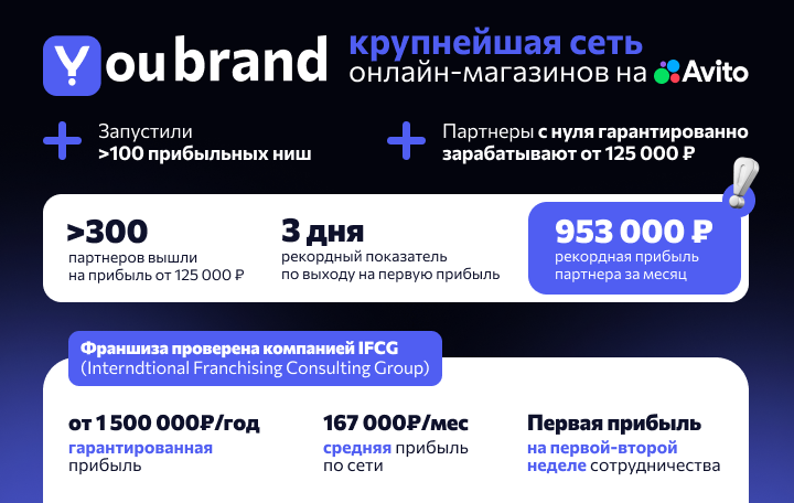 Бизнес-модель YouBrand - это агентская схема на платформе Avito, где партнер выступает посредником. Ему не требуется закупать товары или самостоятельно реализовывать услуги, не требуется арендовать склад и самостоятельно заниматься доставкой. В агентской бизнес-модели основная задача - это привлечение покупателей через объявления, а поставщики (которых мы предоставляем) сами отправляют товар и берут на себя всю логистику. Роль партнера - управлять магазином, общаться с клиентами и контролировать рекламу. Заработок идет от комиссии или разницы в цене. Данная модель подтверждает свою эффективность финансовыми показателями сотен наших партнеров, чья средняя прибыль на данный момент составляет 167 000 рублей в месяц.