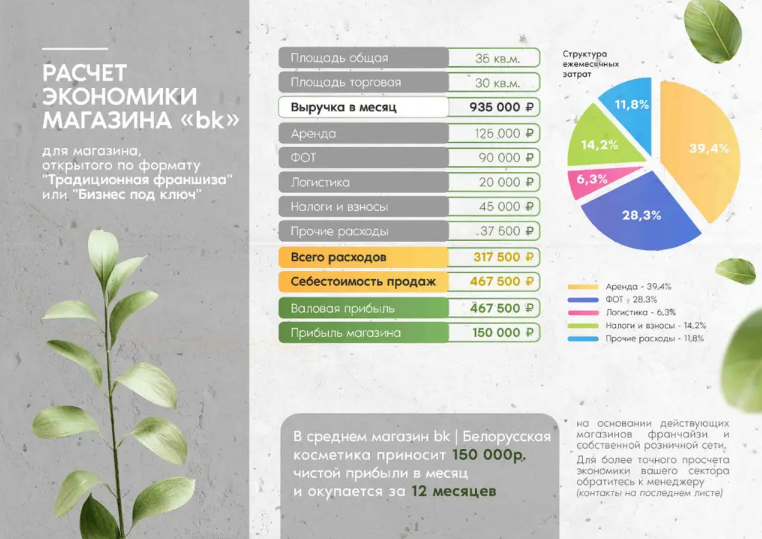 После декрета я решила не возвращаться на старую работу, а попробовать свое дело. Муж поддержал. Опыта у меня мало, так что начать решили с франшизы. Почему выбрала Белорусскую косметику? Тут несколько факторов. Во-первых, я решила, что мне будет проще заниматься косметикой, потому что пользуюсь сама и немного разбираюсь в вопросе. У Белкосметики товар хороший и себя уже успел зарекомендовать. Как и сама сеть. У нас в городе пока мало этих магазинов, но парочка есть. Мы ходили посмотреть, как ид...ут дела — вообще не пустуют, всегда есть покупатели. После этого стали изучать условия. Что нам сразу понравилось: относительно небольшие вливания на старте, небольшой паушальный взнос, и весьма развернутая полноценная поддержка, начиная с организации и открытия, так и дальше. Все самые сложные моменты: выбор локации и точки под магазин, составление бизнес-плана маркетинг, все это франчайзер берет на себя. Насколько легче идти уже проверенным путем, я только сейчас понимаю, что сама даже с помощью мужа, потратила бы в разы больше сил и времени, да и денег тоже. А у них огромный опыт. Сеть работает больше 10 лет. Так что все наработки проверили и отточили в деле. Что меня удивило — с помощью и поддержкой магазин можно открыть довольно быстро. Так что весной мы еще прикидывали и выбирали, а летом уже открылись. Первое время было напряженно, приходилось учиться на ходу, опять же не представляю, как бы я это проделала самостоятельно. Через пару месяцев вошла в колею, стало поспокойнее. Бизнес-план на практике работает где-то под 90%, это очень хороший результат. конечно об окупаемости речь пока вести рано. Но судя по динамике, реально отбить затраты уже осенью.
