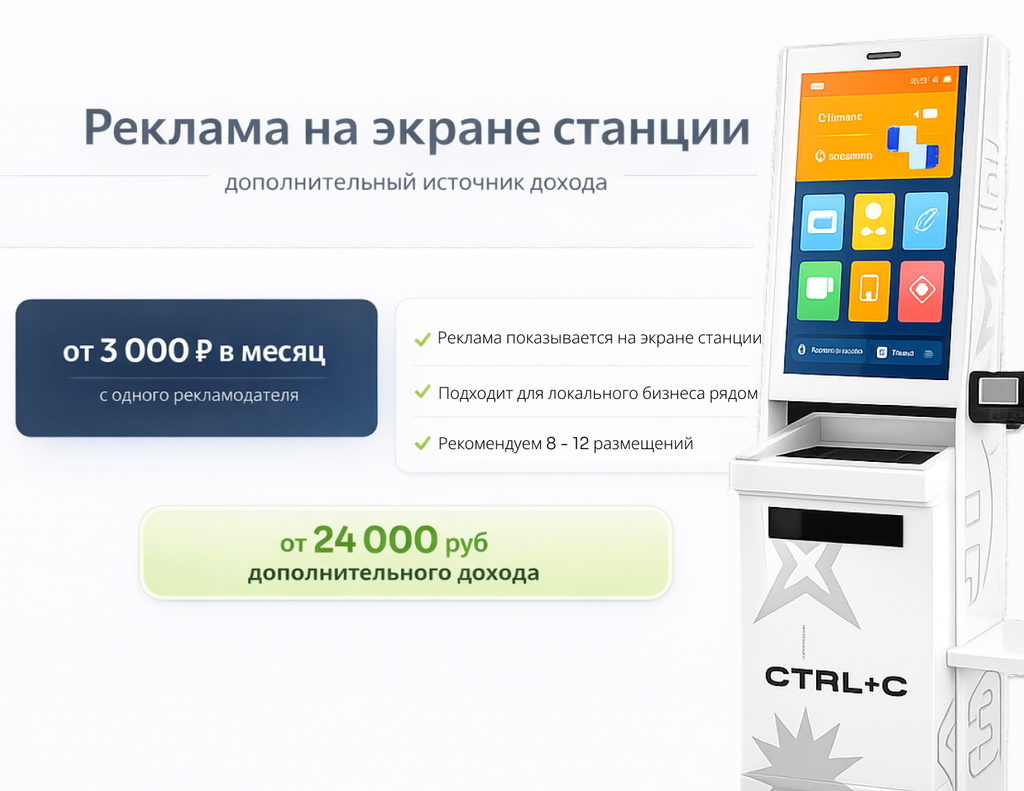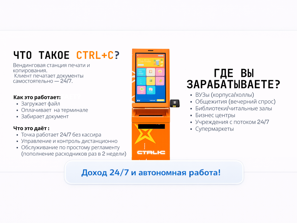 CTRL+C — это вендинговая станция цифровой печати: клиент сам загружает файл, оплачивает и сразу получает распечатку/копию. Точка занимает минимум места, а аренда будет составлять не более 5000 рублей. Бизнес не требует сотрудников и работает 24/7 — особенно востребован там, где документы нужны “срочно”.