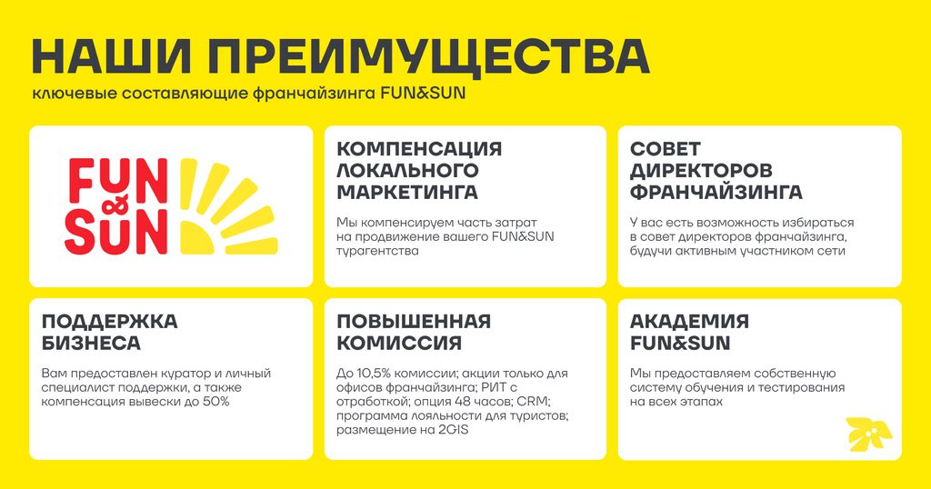 Мы — компания FUN&SUN, занимаемся продажей туров, круизов, размещения в отелях, билетов и т. д. На рынке с 2009 года. За это время открыли 700 точек; 96% из них — по договору франшизы. Партнёрам предлагаем открыть свой филиал FUN&SUN на площади от 12 кв. м. в ТЦ, БЦ или другой локации с высоким трафиком. Полностью поддерживаем на всех этапах, от подписания договора до открытия. Чистая прибыль — от 2,5 млн рублей (уже в первый год). Вложения — от 455 тыс., из них паушальный взнос — от 55 тыс. рублей.