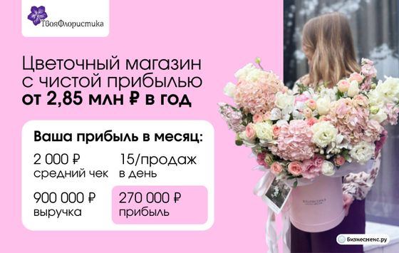 | PIONFLO - цветочный салон | 2015 | 2024 | 490 000 | 2 000 000 | 420 000 | 3% | 10 |