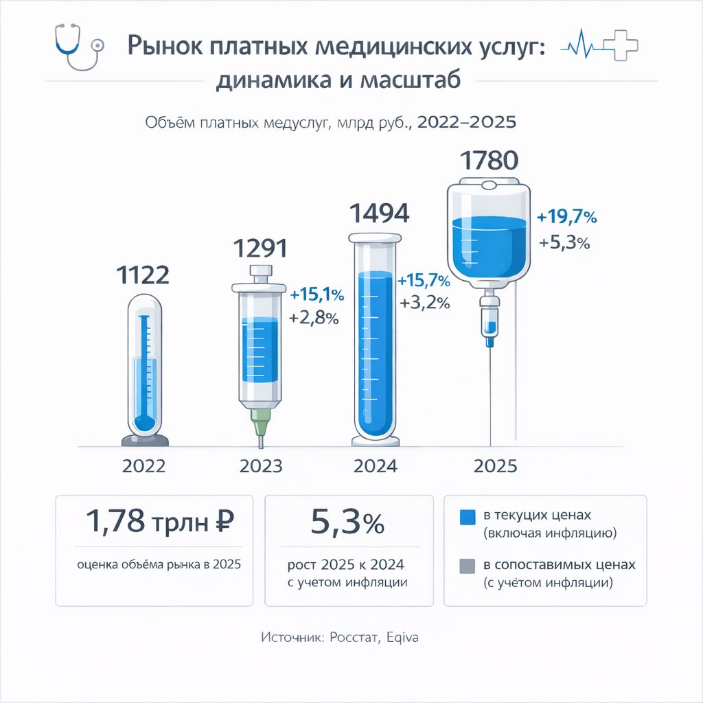 Спрос на платные медицинские услуги в России высокий, а рынок в последние годы только растет. По данным Росстата, за январь–октябрь 2025 года объём платных медуслуг составил 1,53 трлн руб. – к аналогичному периоду 2024 года в текущих ценах показатель вырос на 19,1%. Даже с поправкой на медицинскую инфляцию, по данным Eqiva, реальный рост ниши составил 5,3%.