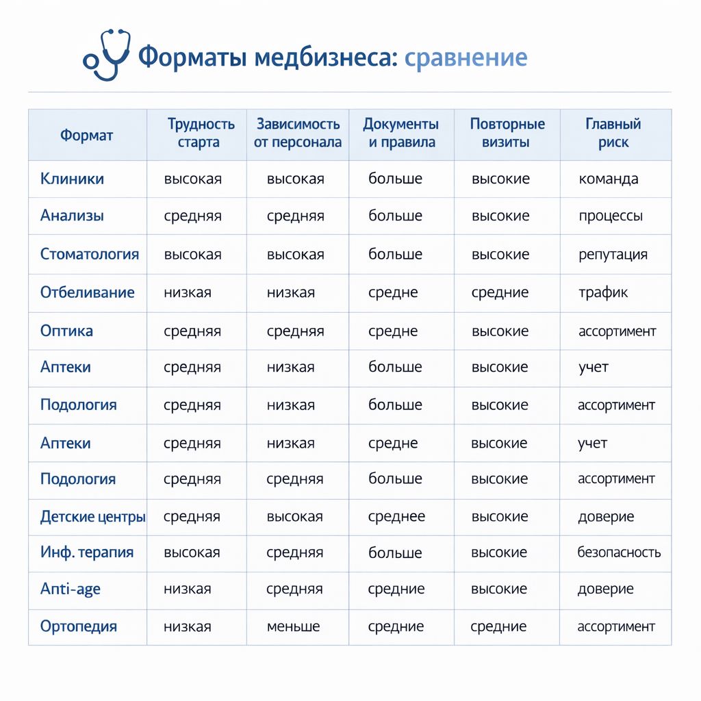 Под медицинскими франшизами имеют в виду не только клиники. Это могут быть и смежные форматы про здоровье в целом: медуслуги, торговля медтехникой и ортопедией, бьюти, профилактика и прочее, где вход проще, а доверие и стандарты все равно критичны.