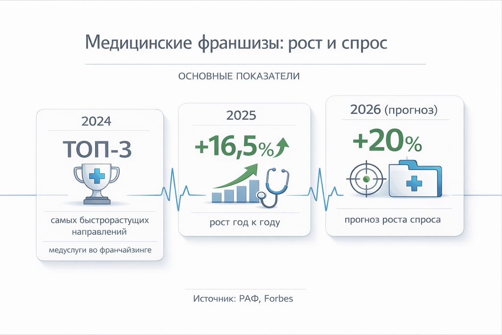 Также отметим, что у медицинских франшиз в последние годы одни из самых сильных показателей среди всех сфер. По данным Российской ассоциации франчайзинга (РАФ), в 2024 году медицинские услуги вошли в топ-3 наиболее быстро растущих направлений во франчайзинге. Позитивные тенденции наблюдались аналитиками в 2025 году (+16,5% год к году), а на 2026 год эксперты давали прогноз по росту спроса на это направление на 20%.