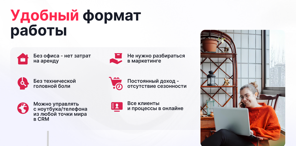 Вы управляете онлайн-агентством маркетинга из любой точки мира. Ваша задача – продажа услуг – продажа услуг сервисов Red Calls и Red Post, услуги по лидогенерации, разработке и продвижению сайтов. Техническую работу выполняем мы.