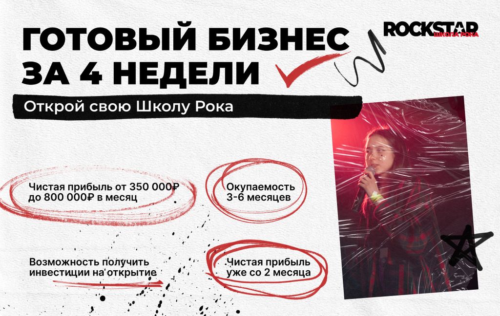 Открой свою «Школу Рока» вместе с нами! Обучаем детей и взрослых вокалу, гитаре, барабанам и клавишам. На рынке с 2011 года, открыли школу в Новосибирске, 3 — по договору франшизы. Все партнеры пришли сами, получили ожидаемый результат, а мы накопили достаточный опыт для открытия в других городах и приглашаем вас стать владельцем своей Школы Рока. Мы уверены в своей модели и готовы предлагать варианты инвестиций на открытие, а если поймете, что музыкальный бизнес – не ваше, выкупим точку обратно. На открытие школы даем от 50 горячих заявок и дальше полностью берем на себя весь маркетинг, обеспечивая стабильный поток клиентов. Модель проверена в городах с высокой конкуренцией: при лучших финансовых показателях, маркетинговый бюджет Школы Рока в десятки раз меньше, чем у конкурентов.🔥 После отладки бизнес-процессов, для управления вам нужно до 8 часов в неделю, а обучиться всему вы можете онлайн или очно у нас в Школе Рока в Новосибирске, которая уже приносит владельцу от 500 тыс. чистыми каждый месяц!