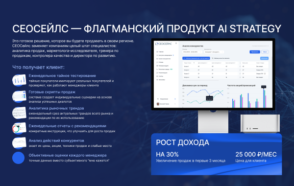 - IT-лицензия на платформу «СеоСейлс» — ваш основной продукт. Полный доступ к системе, которая сама анализирует продажи, проверяет менеджеров и пишет скрипты. Техподдержка 24/7.
