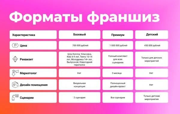 Формат не требует сложного технического оснащения, логистики или товарного запаса – вы работаете с впечатлениями, эмоциями и готовым контентом. Все, что нужно для запуска: подходящее помещение и команда от 3 человек.