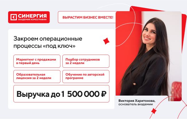 С нашей бизнес-моделью партнёры выходят на выручку до 980 000 ₽ уже в первый месяц работы. Вы получаете готовый дизайн-проект помещения, помощь в подборе локации, а также набор и обучение преподавателей под руководством ведущих хореографов компании. Мы не просто продаём франшизу — мы запускаем бизнес вместе с вами, шаг за шагом, как свой собственный. Присоединяйтесь к бренду, которому доверяют по всей стране, и развивайтесь с корпорацией «Синергия» — лидером в сфере образования.