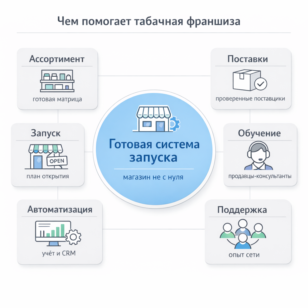 Франшизы в табачной и вейп-рознице в отличие от других сфер франчайзинга, часто выбирают не из-за громкого бренда, а потому что они снимают с предпринимателя самые неприятные и рискованные этапы запуска бизнеса. Для многих это способ быстро войти в рынок без долгого периода проб и ошибок.