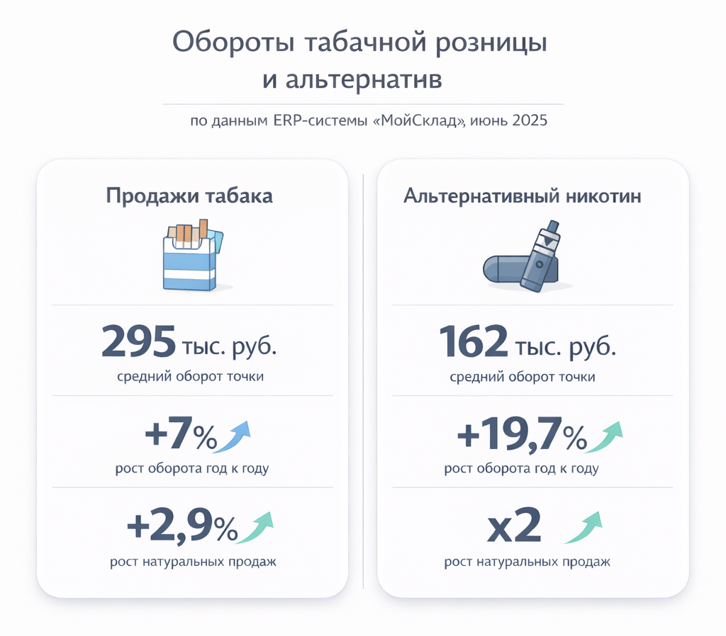 По данным “Контур.Маркета”, с осени 2024 по осень 2025 года продажи сигарет снизились примерно на 23%. По другой информации от аналитиков “МойСклад”, у тех клиентов компании, кто продает альтернативную никотинсодержащую продукцию, за год (с июня 2024 по июнь 2025) прирост оборота составил 19,7% в денежном обороте и вдвое в натуральном, в то время как у продавцов табака – на 7% в денежном и всего на 2,9% в натуральном.
