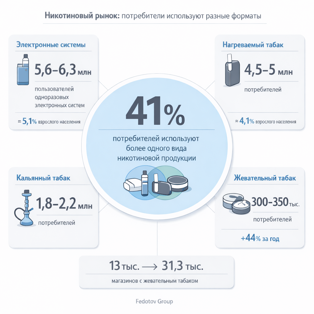 По информации компании Fedotov Group, в 2025 году 41% потребителей отмечают, что используют более одного вида никотиносодержащей продукции – то есть предпочтения потребителей стали более разнообразными. Хорошо эту тенденцию иллюстрирует предложение жевательного табака: если в 2022 году точек, которые его реализовывали, насчитывалось всего 13 тыс., то в 2024 году их стало уже 31,3 тыс., то есть произошел более чем двукратный рост.
