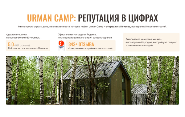 Урман Билд — это строительная компания, рожденная из успеха глэмпинга Urman Camp, основанного предпринимателем Ильнаром Хамидуллиным. Его идея — совместить роскошь комфорта с красотой дикой природы — оказалась настолько востребованной, что выросла в отдельный бизнес.