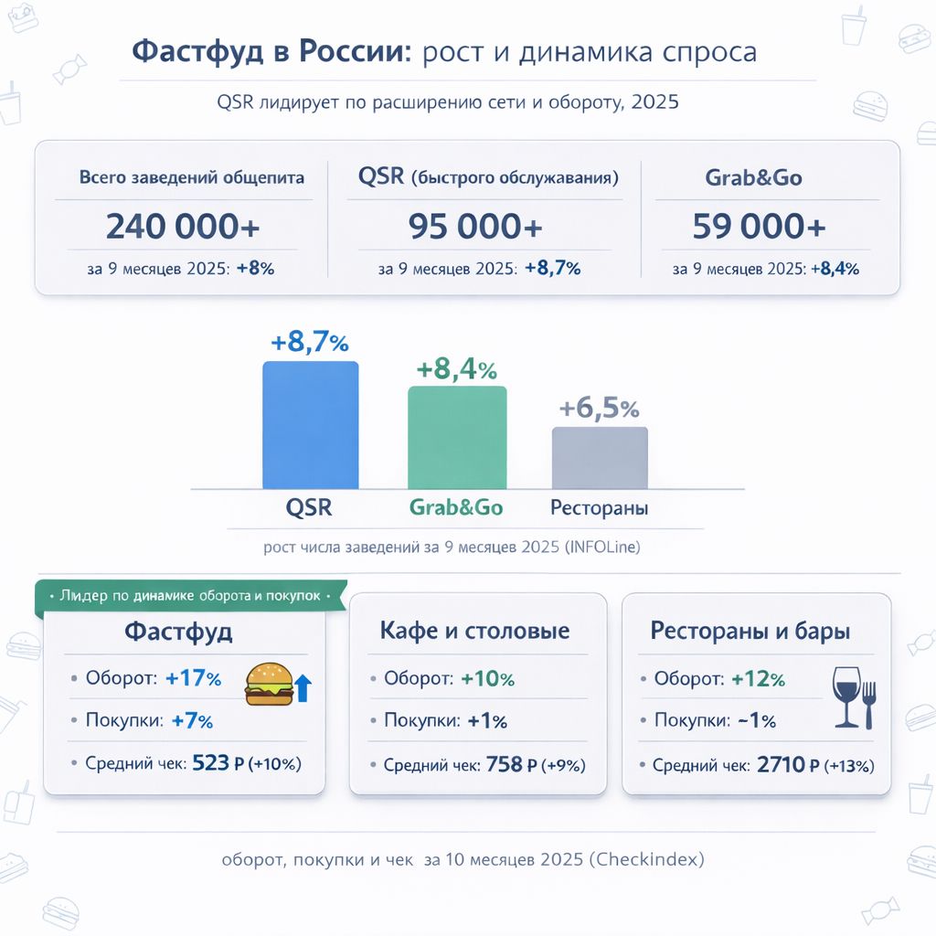 На фоне общего охлаждения рынка именно сегменты быстрого питания чувствуют себя лучше прочих. По данным CheckIndex, в 2025 году точки фастфуда показали более высокую динамику по числу покупок (+7%) и обороту (+17%). Это ключевой макросигнал в том числе в пользу бургерных как одного из основных форматов фастфуда.