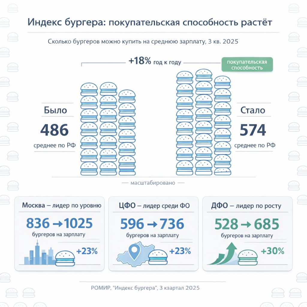 Для оценки категории бургерных полезен не только оборот общепита, но и так называемый «Индекс бургера» от РОМИР – показатель, который отражает покупательскую способность через число бургеров, доступных жителям на среднюю зарплату. По итогам 3 квартала 2025 года зафиксирован рост индекса в среднем по стране на 18% год к году (с 486 до 574 бургеров), а в Москве – до 1025 бургеров (+23%).