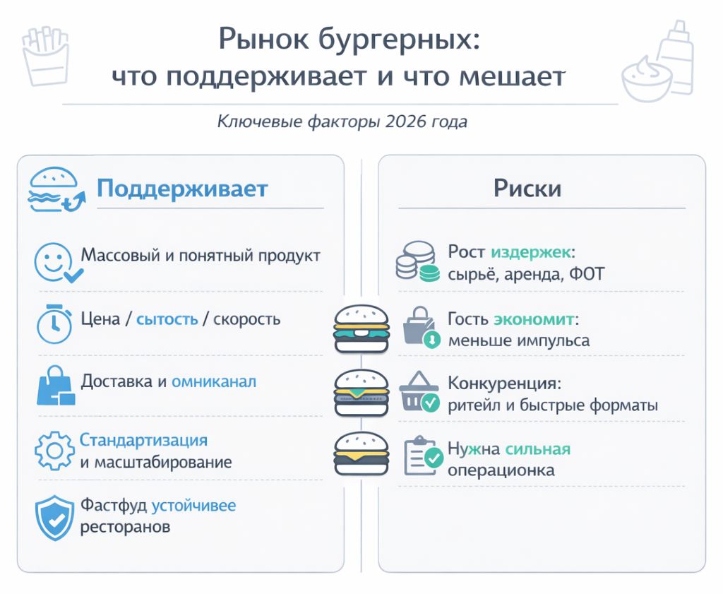Разумеется, то, что фастфуд растет лучше рынка, не означает, что любая бургерная в любой локации будет успешной. В 2026 году сегмент находится под давлением сразу с двух сторон: