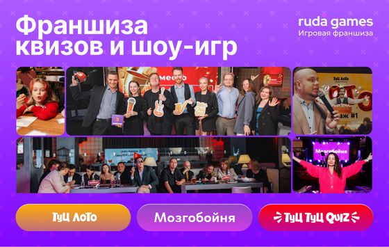 Франшиза российского разработчика и издателя интеллектуально-развлекательных игр, создателя таких проектов как "Мозгобойня" и "Туц Туц Quiz". На рынке с 2012 года. Открыто более 170 представительств по всей РФ. Покупая франшизу от Ruda Games, вы получаете полное обучение с погружением во все технические вопросы бизнеса, научитесь привлекать игроков, запускать квизы в любом городе и увеличивать прибыль. Команда даёт все инструменты для развития - от помощи и контента для проведении игр до пошаговых инструкций и технологий, позволяющих автоматизировать бизнес. Средняя прибыль с одного проекта - 150 000 рублей в месяц.