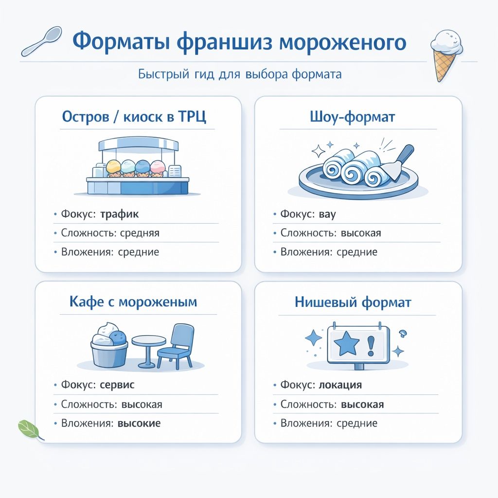 Среди франшиз мороженого встречаются разные модели: от классических сетевых “островов” и павильонов до автоматизированных кафе и нишевых идей.