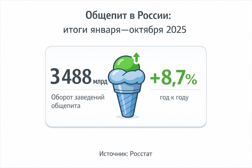 По данным Росстата, оборот общественного питания в РФ за январь–октябрь 2025 года составил 3 488 млрд руб., что в сопоставимых ценах выше на 8,7%, чем в аналогичном периоде 2024 года, приводит информацию ТАСС.